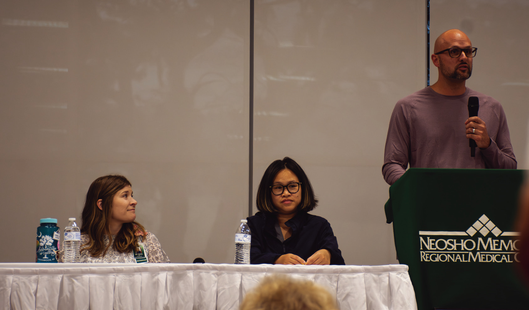 TOP PHOTO: Local medical professionals listen to a question during Neosho Memorial Regional Medical Center’s recent Night Out for Wellness event. From left are: Dr. Mackenzie Wahl, Dr. Yi Ying Law, and Dr. Matthew Leroy, BOTTOM PHOTO: Dr. Jason Robinson, left, and Dr. Bruce Lee, right, listen to a question during a physician panel at SEK Impact Center. Hannah Emberton | Tribune photos