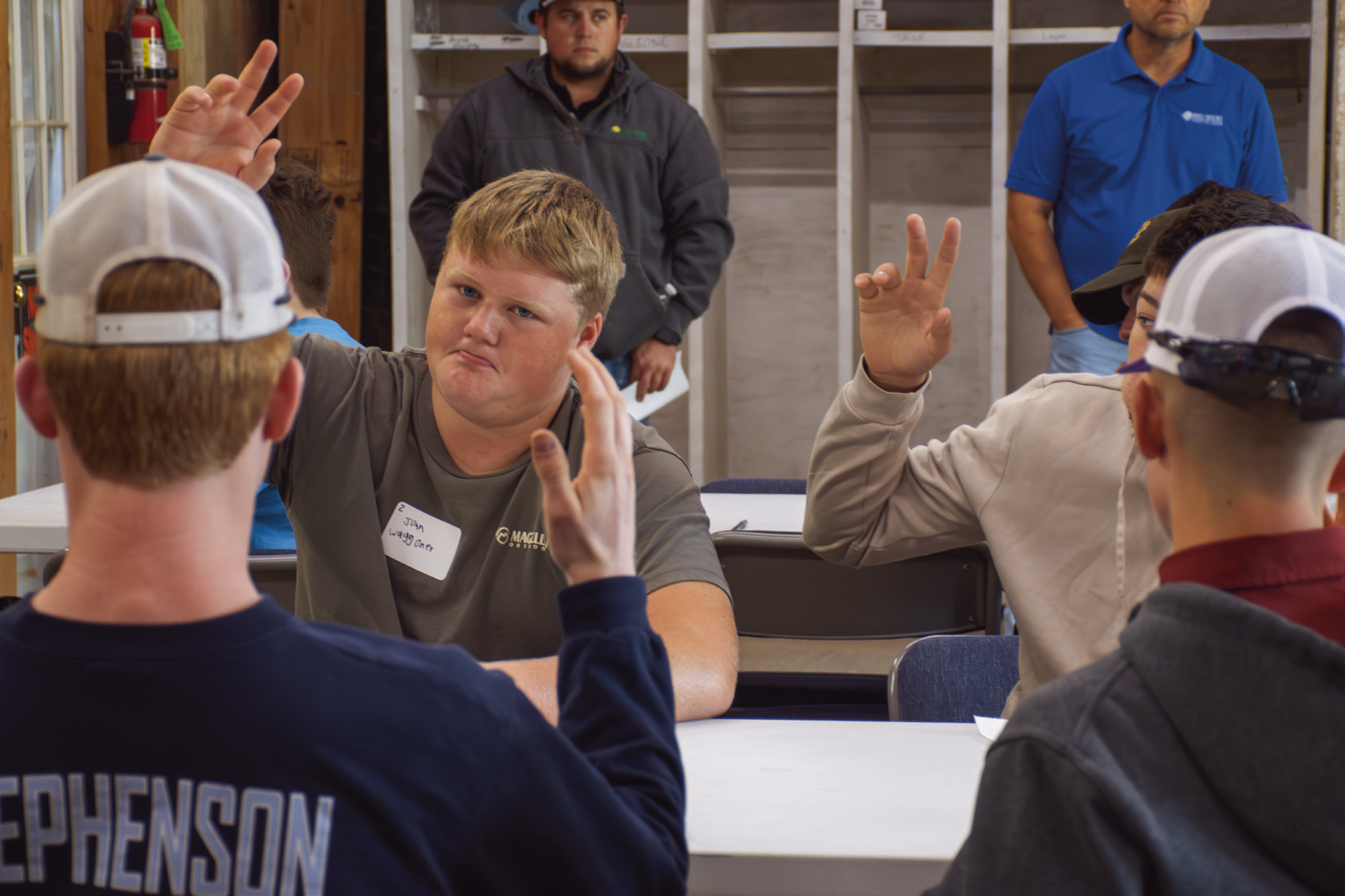 TOP PHOTO: Area students learned how a fertilizer elevator fills a truck at Midwest Fertilizer. BOTTOM PHOTO: John Waggoner, and other local students raise their hands to a question asked by Hilary Worcester during a recent career immersion event, Hannah Emberton | Tribune photos