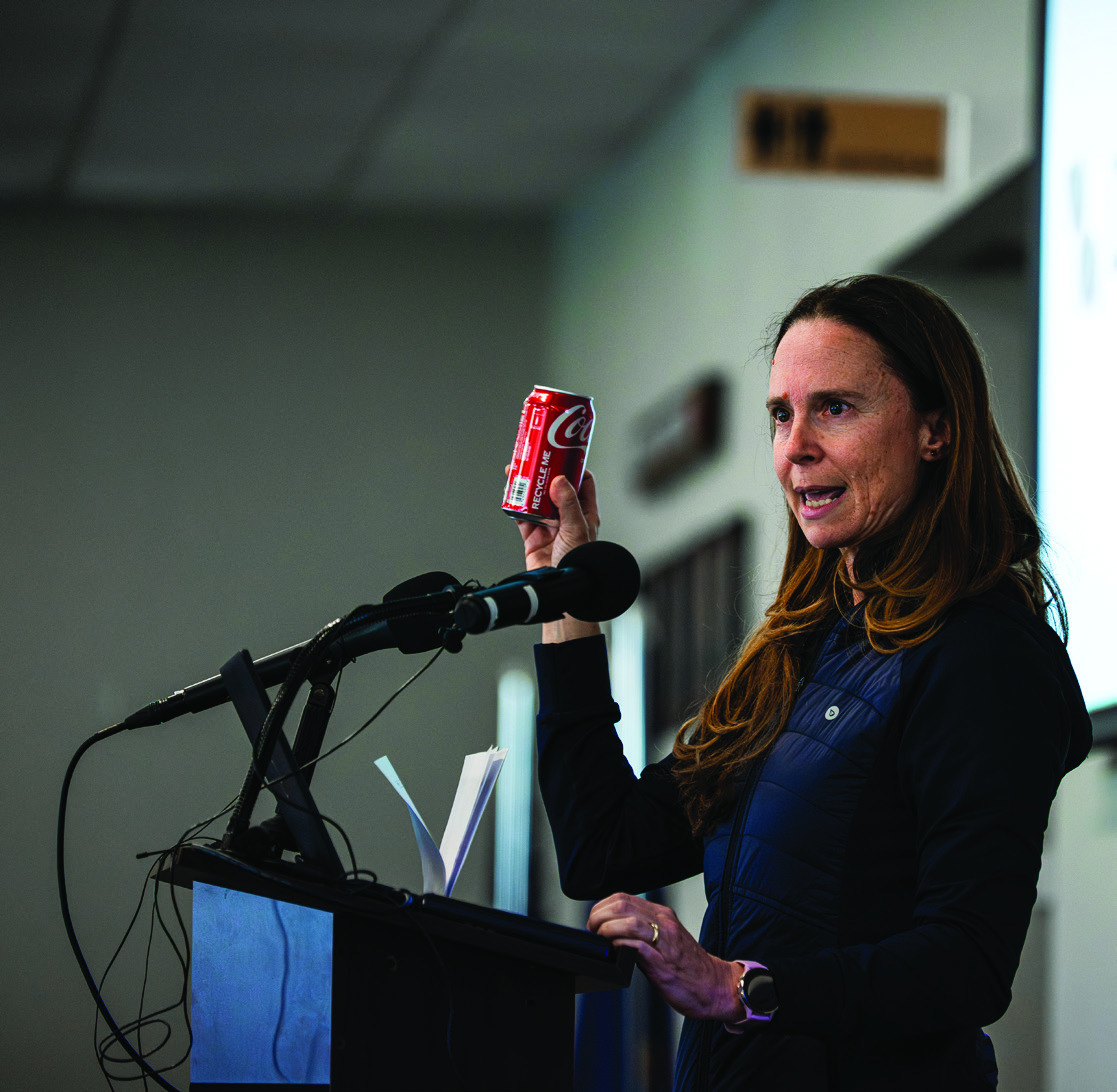 Above: Deep Fission CEO Elizabeth Muller turns on a the smallest rig used to take samples during the groundbreaking ceremony last week. Below: Muller explains that nuclear energy is dense, and that both the energy used and the waste produced in a single lifetime could fit into a can of soda. Sean Frye | Tribune photos