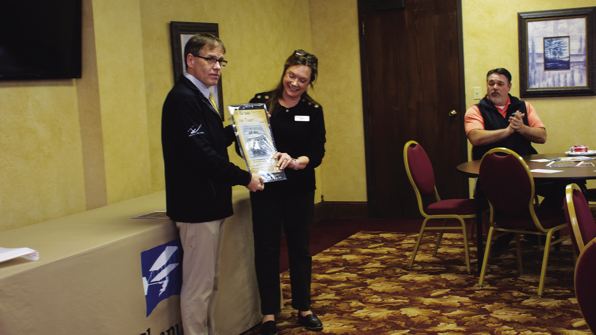 Chanute Area Chamber of Commerce Executive Director Amy Jensen accepts a plaque from C. Edward Young, a member of the Kansas Association of Airports that puts on the Fly Kansas Tour, where a cohort of pilots fly their personal planes to multiple stops in Kansas. Chanute was not initially a stop for the tour but was selected at the last minute as a backup. The plaque served as a thank-you to the local partners and volunteers who made the stop possible in less than two weeks. Young called it one of the most memorable stops on the tour. Adrienne Wahl | Tribune Photo